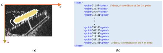 Figure 6 shows the label format of PSeg-SSDD. The initial release version of SSDD did not provide such labels for scholars. From Figure 6, there are a series of points used to describe the outline of the ship. These points can be connected into a closed polygon. We use a famous and open annotation tool, LabelMe [117], to obtain these points. To be clear, due to scale differences of ships in SSDD, ships with different scales or sizes must result in different numbers of outline points. Large ships offer more points while small ones offer fewer points. Moreover, in Figure 6b, the order of these points is counterclockwise.
