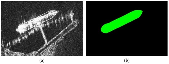 Based on PSeg-SSDD, one can study the semantic segmentation task by using a fully convolutional network (FCN) [118] or U-Net [119]. Semantic segmentation refers to classify each pixel in the image. For SAR ship detection, that will be a ship-background binary pixel-level classification task. If one pixel is predicted with a “1” label, then it will be regarded as one ship pixel. On the contrary, for a “0” label, it is the background. Taking the PASCAL VOC dataset format as an example, we provide the semantic segmentation mask in Figure 7. In Figure 7b, the black regions in the mask belong to background pixels meanwhile the green ones belong to ship pixels. Because there is only one ship category, the colors in the mask are only black and green. This is different from the 20 colors in the PASCAL VOC dataset.
