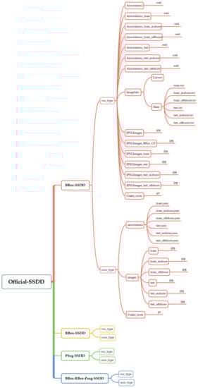 Figure 9 is the diagrammatic sketch of the data directory. In the root directory (Official-SSDD), there are four folders―BBox-SSDD (labels of BBox), RBox-SSDD (labels of RBox), PSeg-SSDD (labels of PSeg), and BBox-RBox-PSeg-SSDD (labels of BBox, RBox, and PSeg) provided to study the “all-in-one” ship detection. We provide two types of annotations―the PASCAL VOC format (voc_type) [113] and the COCO format (coco_type) [114].