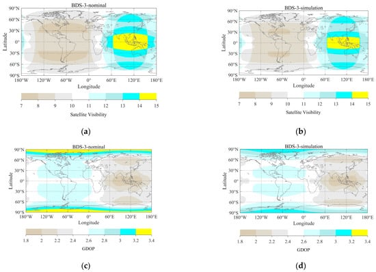 To assess the performance of BDS-3 by adjusting the inclination of BDS-3I from 55° (BDS-3-nominal) to 75° (BDS-3-simulation), satellite visibility and GDOP were calculated. The results are shown in