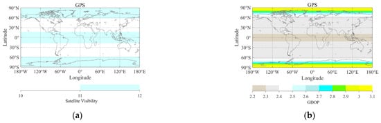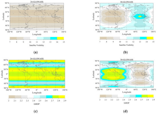 Figure 4. It can be seen that 7–10 satellites of 24-GLONASS can be observed worldwide. Fewer satellites can be observed over mid-latitude regions (