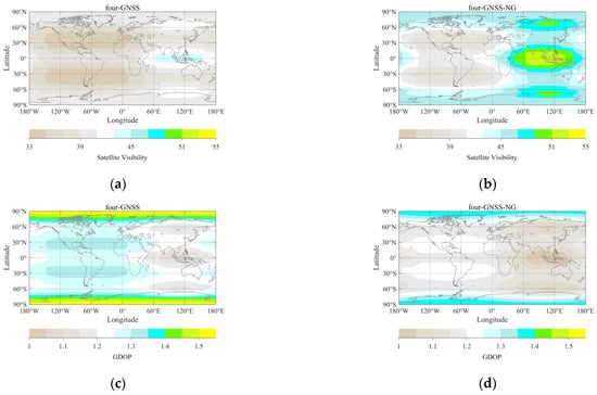 The satellite visibility and GDOP of the four-GNSS and four-GNSS-NG are illustrated in