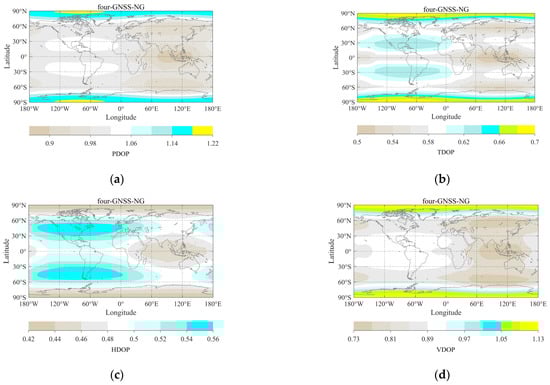 Based on Equation (15), we calculated the DOPs of combined positioning of the four-GNSS-NG. The results are presented in