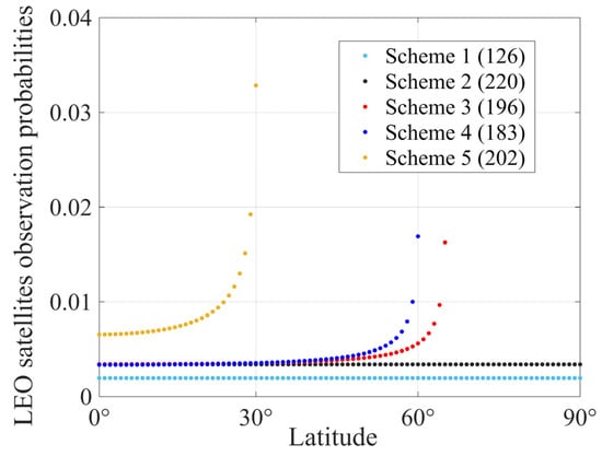 of the GNSS. The distribution of polar-orbiting LEO constellations (Schemes 1 and 2) is more even than that of inclined-orbiting LEO constellations at all latitudes. Because a satellite travels north–south over the Earth, and the angular velocity is only in this direction. Comparing to Schemes 3 and 4, the distribution of the Scheme 5 LEO satellites with an inclination angle of 30° is narrower, which results in higher observation probabilities.