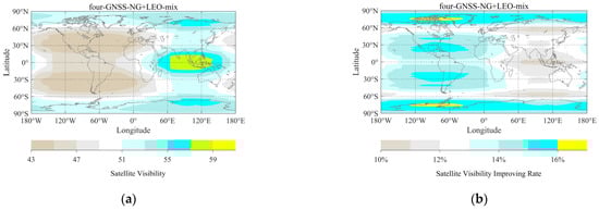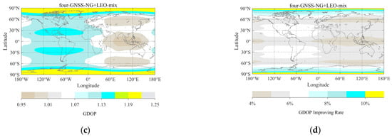 ). With more visible LEO satellites in this region (average: 6.86), the average improvement rate of the four-GNSS-NG+LEO-mix reaches 14.7%. Likewise, in the mid–low latitude region of the Western Hemisphere, approximately five more satellites can be observed, and the improvement rate is 14.4% on average. In general, the average visible satellites of the four-GNSS-NG+LEO-mix is 50.97. Ranging from 0.95–1.25 (average: 1.12), the GDOP of the four-GNSS-NG+LEO-mix decreases by about 4.1–11.0% (average: 6.2%) compared to four-GNSS-NG, and at the high latitudes, that value is almost more than 9%.