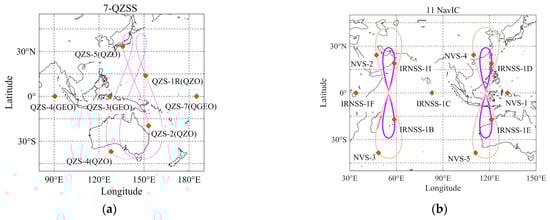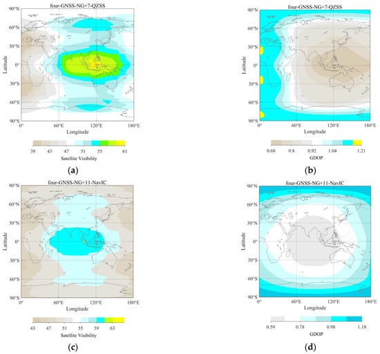Table 7 (to simplify the calculation, the QGEO satellite is regarded as a GEO satellite). One can see that the QZSS service is roughly in the Asia-Pacific region. More than two satellites can be observed for 4-QZSS in (60°E–180°E, 60°S–60°N), while 7-QZSS exceeds four. Specifically, in Southeast Asia and in Northwestern Australia, five visible satellites can be guaranteed. However, QZSS satellites are rarely observed at low altitudes in the Western Hemisphere. Similar to the QZSS, there are almost no visible NavIC satellites in most areas of North and South America. For 7-NavIC, four or more visible satellites are present in (30°E–150°E, 60°S–60°N) while the number of 11-NavIC satellites reaches six. Specifically, with full 11-NavIC constellations, at least 10 satellites are always visible from the whole India as well as its surrounding areas. Generally, the visibility of 7-QZSS satellites (average: 5.57) increases by 0.9~3 (average: 2.17) in the areas of (60°E–180°E, 60°S–60°N) compared to 4-QZSS satellites, and the value for 11-NavIC satellites (average: 8.78) with 7-NavIC is 1.83–4 (average: 3.11) in the areas of (30°E–150°E, 60°S–60°N).