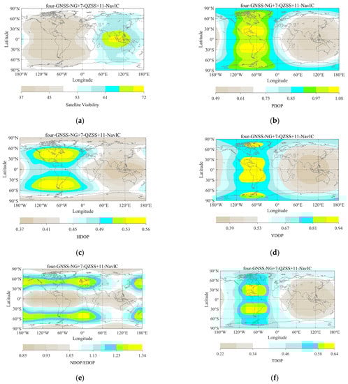 Figure 14 presents the satellite visibility and DOPs of the four-GNSS-NG+7-QZSS+11-NavIC on a global scale. The statistical results are listed in
