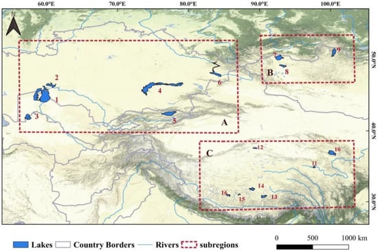 Locations of lakes selected in this study: The rectangles represent the spatial extent of general endorheic regions in (A) Central Asia, (B) the western Mongolian Plateau, and (C) the Tibetan Plateau. The lakes in Central Asia include (1) the South Aral Sea, (2) the North Aral Sea, (3) Sarykamysh, (4) Balkhash, (5) Issyk-Kul, and (6) Zaysan; The lakes in the Mongolian Plateau are (7) Uvs, (8) Hyargas, and (9) Hovsgol; The lakes in the Tibetan Plateau are (10) Qinghai, (11) Ngoring, (12) Ayakkum, (13) Namco, (14) Silingco, (15) Ngangzco, and (16) Zharinamco.