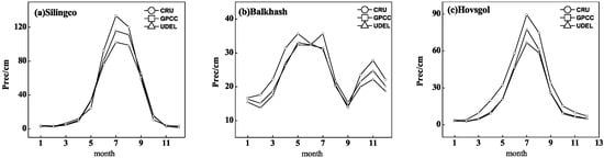 The seasonal cycle of precipitation from different gridded datasets over three lakes from three endorheic lake zones during the period of 1990–2016: (a) Lake Silingco, selected as the example for the Tibetan Plateau (TP), (b) Lake Balkhash, from the Central Asia (CA), and (c) Lake Hovsgol, from the Mongolian Plateau (MP).