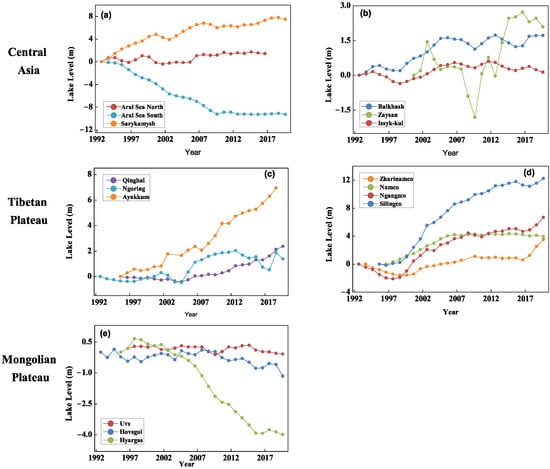 The annual change of water level in lakes located at Central Asia (a,b), Tibetan Plateau (c,d), and Mongolian Plateau (e).