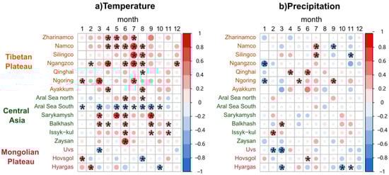 The correlation relationship map between water level variation and monthly precipitation and air temperature over three lakes in the Mongolian Plateau: Asterisks mark significant correlations. The circle size scales with the absolute correlation coefficient value.