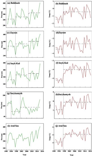 The ‘dry-gets-drier’ and ‘wet-gets-wetter’ pattern has been recognized across the globe as a part of a global change [,]. Previous studies have reported a drying trend in CA and a warming trend in MP [], and a tendency for warmer and wetter climates in western Kyrgyzstan zones and Tibetan Plateau [,], especially after 1997 []. Air temperature and precipitation were found to be the main factors affecting the changes in the water level of most lakes in TP [], CA [,], and MP [,]. This temperature increase over a lake basin could accelerate the melting rate of snow and glaciers, but also lengthen the period of melting, providing lakes with more water. An increase in precipitation supplies water to lakes directly as well as via surface and groundwater runoff. To qualify the reasons for the heterogeneous patterns observed in the lake water levels, we examined the relationship between the two major climatic factors—precipitation and air temperature—and the water level of terminal lakes.