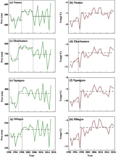 The significant regime shift in time series of precipitation (green line, left panel) and temperature (red line, right panel) over four lakes in the southern part of the Tibetan Plateau: vertical lines represent regime shift years and horizontal dash lines represent the mean value of each regime.