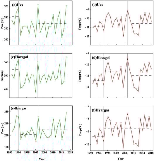 The significant regime shift in time series of precipitation (green line, left panel) and temperature (red line, right panel) over three lakes in the Mongolian Plateau: vertical lines represent regime shift years and horizontal dash lines represent the mean value of each regime.