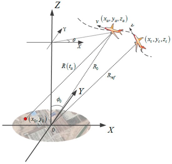 Scene center is selected as the reference point for MOCO. To simplify the subsequent analysis without loss of generality, the curvilinear aperture is assumed to have occurred in the slow time interval of , therefore the time instant at the aperture center is defined as the initial time . The coordinates of the aperture center are denoted by and the slant range can be expressed as