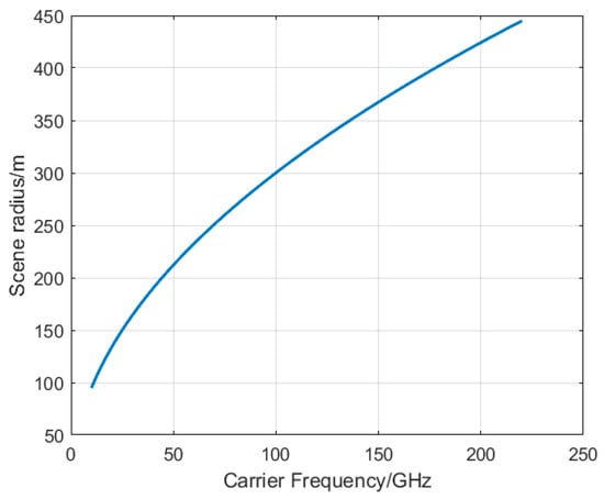 where is azimuth resolution, is wavelength, is the maximal allowable scene radius. For given azimuth resolution 0.15 m, the relationship between scene radius and carrier frequency is shown in Figure 2.