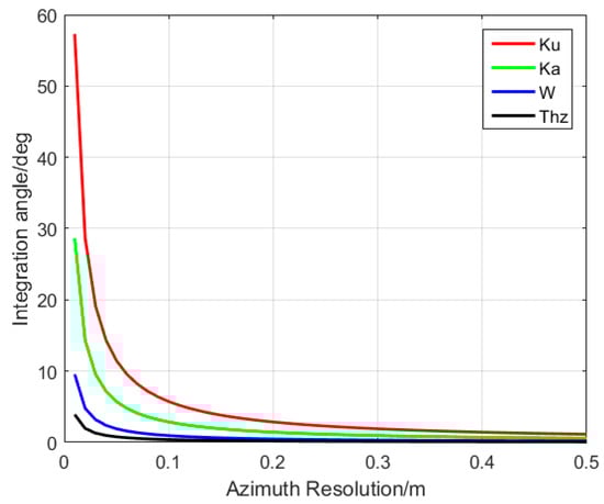 According to Equation (16), the azimuth resolution is inversely proportional to azimuth integration angle. The relationship between the azimuth integration angle and resolution in Ku, Ka, W and THz bands is shown in Figure 6. A given azimuth resolution (high) can be achieved at a smaller azimuth integration angle if the carrier frequency is higher. For PFA, based on a small synthetic aperture angle assumption, we can hardly use low carrier frequency for high resolution imaging.