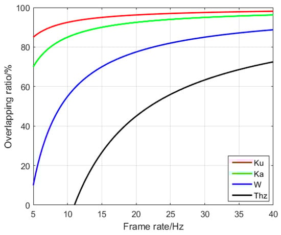where denotes sub-aperture overlapping ratio. We set the , and , then the relationship between overlapping ratio and frame rate is shown in Figure 7. Generally, the frame rate is required to be more than 5 Hz to make ViSAR look more consecutive. For Ku band, the sub-aperture overlapping ratio needs to exceed 80% to meet the frame rate requirements.