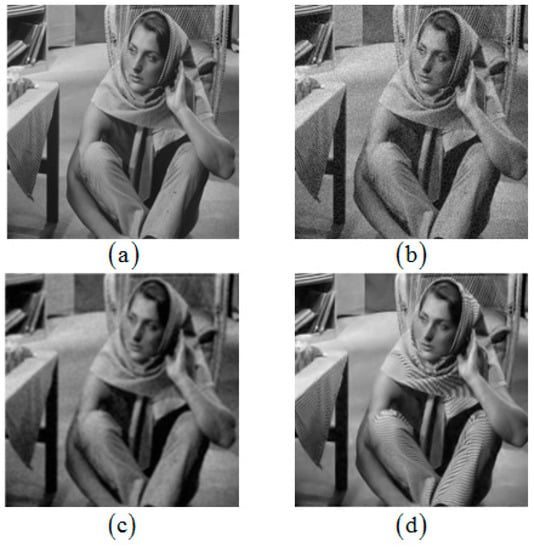 where , , and are the values of the reference and filtered images, respectively, observed on the one-pixel wide lines on both sides of the edge. Larger values correspond to a better edge retaining ability of the filter. Signal-to noise ratio (SNR) [] reflects the quality of filtered images and larger values correspond to a better quality. The expression of SNR is defined as