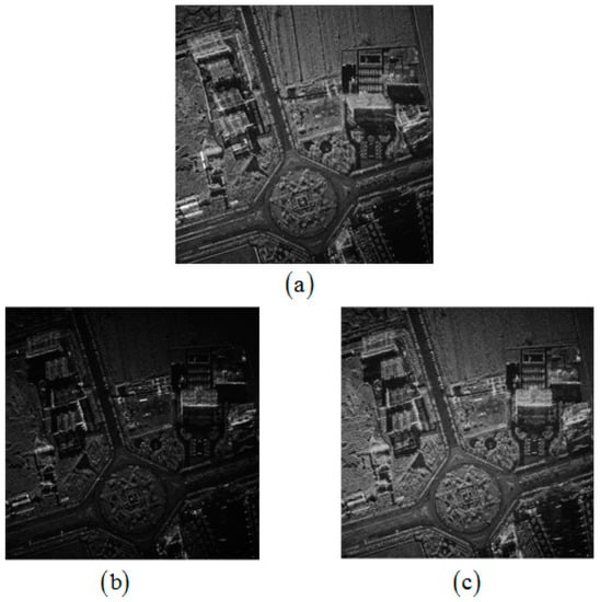 To improve the image SNR, there are several methods that could be used such as spatial filtering algorithm and transform domain filtering algorithm. Compared with spatial filtering algorithm, transform domain filtering algorithm enhances the ability of preserving the detail structure and has high computational efficiency. Lee filter and non-subsample shearlet transform (NSST) [,] are the typical methods of spatial filtering algorithm and transform domain filtering algorithm respectively. Figure 11 shows the results of Lee filter and NSST. There are several indexes which can assess the performance of each method. For the image of size , assume the filter window is , the complexity analysis of two methods is shown in Table 1.