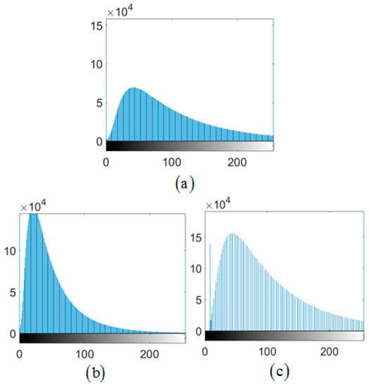 To uniform the brightness of different images, histogram transfer algorithm is applied []. Firstly, the transfer map is calculated according to grey histogram of the reference image. Secondly, according to the transfer map, the original image is mapped onto the histogram of the reference image. As shown in Figure 12, Figure 12a is the reference image and Figure 12b is the original image, and after the histogram transfer, the grey scale of Figure 12c is uniformed to Figure 12a. The grey scale histograms of Figure 12a–c are shown in Figure 13a–c, respectively.