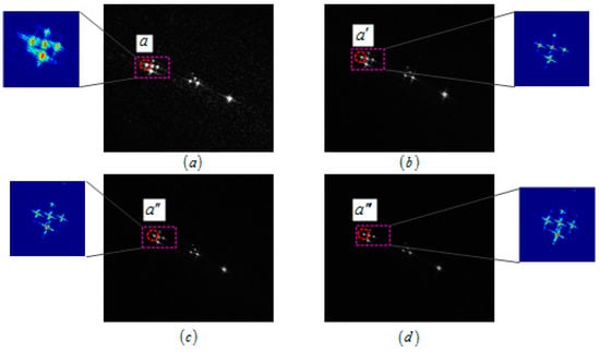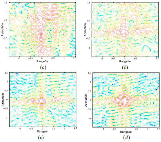 The azimuth integration angle was , resulting in 0.15 m azimuth resolution. To achieve 15 Hz frame rate, the overlapping ratio can be set 26%. According to (11), the DOF was 283 m, which is much larger than experimental size, therefore the image defocused, introduced by planar wave approximation, was neglected. To verify the effectiveness of three-step MOCO, we selected an imaging result of a single frame as shown in Figure 17. In order to compare visibility, four same position targets , , and were selected to be compared, and the contour map results are shown in Figure 18. Point seriously defocused along azimuth. It revealed that the motion error greatly impacted the focusing properties. Compared with point , point was refocused by MD, which the main lobe focused well. However, the residual high order phase error caused the asymmetrical distribution of the side lobe. Point was processed by MD and PGA, and we can see that the main lobe was well focused and the side lobe was symmetrically distributed. As mentioned before, main lobe widening and energy loss seriously affect the performance of PGA, therefore point which was processed by PGA directly is not focused as well as point . The azimuth profile of point , , and are shown in Figure 19.