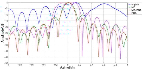 In order to solve the above problem, MD algorithm was applied to compensate for quadratic phase error before PGA. As shown in Figure 9, after MD compensation, main lobe widening and energy loss are effectively suppressed which can greatly improve the performance of PGA.