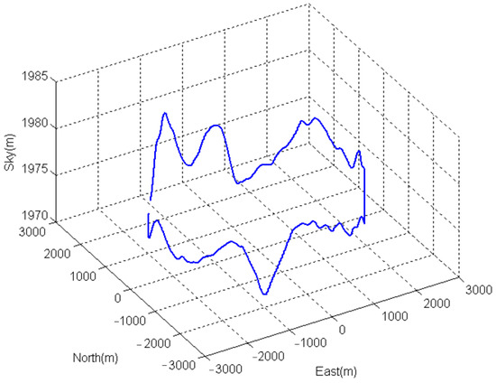 To verify the ability of the long-time persistent surveillance of ROI, another experiment was carried out by National University of Defense Technology in Shaanxi province, China. The carrier frequency of radar was Ku band. The size of the experimental scene was , and the experimental scene from Google Earth is shown in Figure 22. Figure 23 shows the 3D flight trajectory. Compared with linear spotlight SAR, circular SAR (CSAR) can illuminate the targets for long time which can achieve long-time persistent surveillance.
