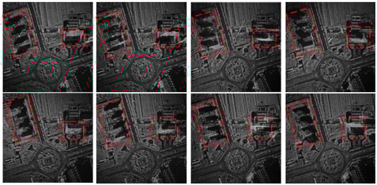 After all frame images were processed by ViSAR procedures, the ViSAR could be obtained. It shows eight frame images from different azimuth angles in Figure 25. There are three residential buildings located in the northwest and a commercial building in northeast which are marked with red rectangles. Noticeably, the large shadow formation of buildings covers different large space of images in different azimuth angles. Objects behind the buildings remain hidden to the observer. The same is true for objects in front of the building (in the LOS direction to the radar), because of the large foreshortening of the building.