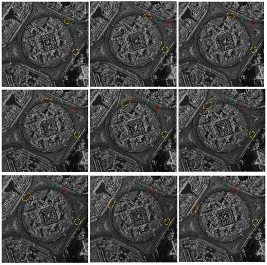 The capability of detecting and tracking the moving targets is presented in Figure 26. The images were chosen in the consecutive order in a slightly interval time to better represent the dynamics of the scene. In total, the illustrated scene comprised of interval time 18 s, corresponding to integration angle . Due to shadows formed by moving vehicles that can show a clear contrast compared to ground clutter, we can track the vehicles easily. For tracking vehicles, the quality of shadow is an important factor. While the vehicle was moving, the duration time that the parts of area covered with shadow during the total sub-aperture time determine the quality of the shadow []. If the car is going fast or sub-aperture time is long, the shadow may smear and be buried in ground clutter [].
