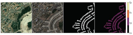 Example of the proposed framework change detection performance on the LEVIRCD test set [] (architecture: mantis CEECNetV1). From left to right: input image at date 1, input image at date 2, ground truth buildings change mask, and colour-coded the true negative (tn), true positive (tp), false positive (fp), and false negative (fn) predictions.