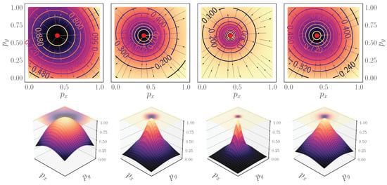 In Figure 2, we provide a simple example for a ground truth vector and a continuous vector of probabilities . On the top panel, we construct density plots of the Fractal Tanimoto function with complement . The gradient field lines that point to the ground truth are overplotted. In the bottom panels, we plot the corresponding 3D representations. From left to right, the first column corresponds to , the second to , and the third to . It is apparent that the effect of the d hyperparameter is to make the similarity metric steeper towards the ground truth. For all practical purposes (network architecture, evolving loss function), we use the average fractal Tanimoto loss (last column) due to having steeper gradients away from optimality. In order to avoid confusion between the depth d of the fractal Tanimoto loss function and the depth of the fractal Attention layer (introduced in Section 2.3), we will designate the depth of the loss function with the symbol :