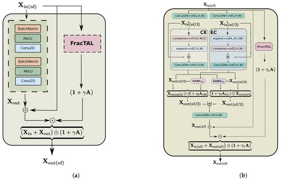Left panel (a): the FracTALResidual unit. This building block demonstrates the fusion of the residual block with the self attention layer FracTALevaluated from the input features. Right panel (b): the CEECNet (Compress–Expand/Expand–Compress) feature extraction units. The symbol ⊎ represents concatenation of features along the channel dimension (for V1). For version V2, we replace all of the concatenation operations, ⊎, followed by the normalised convolution layer with relative fusion attention layers, as described in Section 2.4.3 (see also Listing A.3).