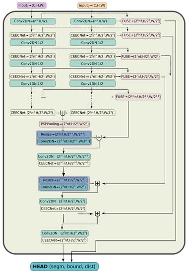 In addition to the previously mentioned sections, the following sections complete the work. In Section 2.6, we describe the setup of our experiments. In Section 3.1, we perform an ablation study of the proposed schemes. Finally, in Appendix C, we present various key elements of our architecture in mxnet/gluon style pseudocode. A software implementation of the models that relate to this work can be found on https://github.com/feevos/ceecnet, (accessed on 6 September 2020).