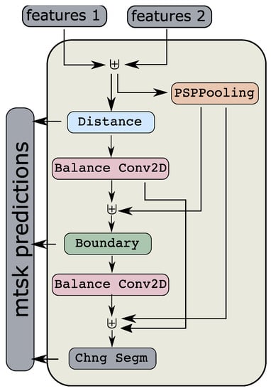 Given the above, we now proceed in detailing the mantis macro-topology (with CEECNetV1 building blocks, see Figure 5). The encoder part is a series of building blocks, where the size of the features is downscaled between the application of each subsequent building block. Downscaling is achieved with a normed convolution with stride, s = 2, without using activations. There exist two encoder branches that share identical parameters in their convolution layers. The input to each branch is an image from a different date, and the role of the encoder is to extract features at different levels from each input image. During the feature extraction by each branch, each of the two inputs is treated as an independent entity. At successive depths, the outputs of the corresponding building block are fused together with the relative attention methodology, as described in Section 2.4.3, but they are not used until later in the decoder part. Crucially, this fusion operation suggests to the network that the important parts of the first layer will be defined by what exists on the second layer (and vice versa), but it does not dictate how exactly the network should compare the extracted features (e.g., by demanding the features to be similar for unchanged areas, and maximally different for changed areas—we tried this approach, and it was not successful). This is something that the network will have to discover in order to match its predictions with the ground truth. Finally, the last encoder layers are concatenated and inserted into the pyramid scene pooling layer (PSPPooling—[,]).