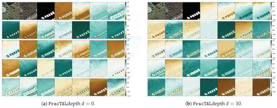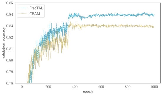 As stated previously, it is possible to extend the definitions of spatial and channel products in a way where we compare each of the channels (respectively, spatial pixels) of the query with each of the channels (respectively, spatial pixels) of the key. However, this imposes a heavy memory footprint and makes deeper models, even for modern-day GPUs, prohibitive. This will be made clear with an example of FracTALspatial similarity vs. the dot product similarity that appears in SAGAN [] self-attention. Let us assume that we have an input feature layer of size (e.g., this appears in the layer at depth 6 of UNet-like architectures, starting from 32 initial features). From this, three layers are produced of the same dimensionalty, the query, the key, and value. With the Fractal Tanimoto spatial similarity, , the output of the similarity of query and keys is (Equation (12)). The corresponding output of the dot similarity of spatial compoments in the self-attention is → (Equation (11)), having a C-times higher memory footprint.