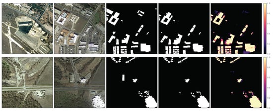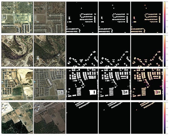 Caye Daudt et al. [] presented and evaluated various strategies for land cover change detection, establishing that their best algorithm was a joint multitasking segmentation and change detection approach. That is, their algorithm simultaneously predicted the semantic classes on each input image, as well as the binary mask of change between the two.