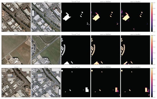 Change detection is one of the core applications of remote sensing. The goal of change detection is to assign binary labels (“change” or no “change”) to every pixel in a study area based on at least two co-registered images taken at different times. The definition of “change” varies across applications and includes, for instance, urban expansion [], flood mapping [], deforestation [], and cropland abandonment []. Changes of multiple land-cover classes, i.e., semantic change detection, can also be addressed simultaneously []. It remains a challenging task due to various forms of change owed to varying environmental conditions that do not constitute a change for the objects of interest [].