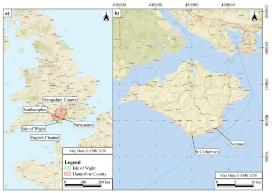 The focus of this project is the town of Ventnor (SZ 55,944 77388), on the southern coastline of the Isle of Wight, United Kingdom. The Isle of Wight is located in the English Channel, between 3 and 8 km from the Hampshire coast mainland. The location of the Isle of Wight in relation to Great Britain is shown in Figure 1a, with the location of Ventnor also shown in relation to the Isle of Wight in Figure 1b. From a geological perspective the Isle of Wight forms part of the Hampshire Basin, which consists of Cretaceous and Paleogene age sedimentary rocks. The southern half of the island consists of Cretaceous outcrops of chalk, limestone, mudstone, sandstone, and siltstone [,].