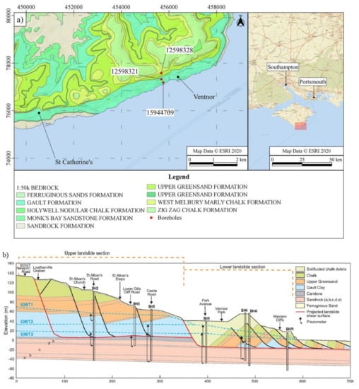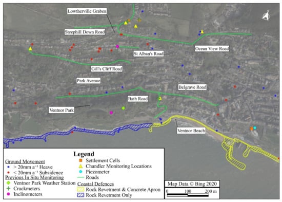 Coastal instabilities are an ongoing problem worldwide, occurring in various climates, topography, and geological formations. It was estimated that approximately 28,000 km2 of coastline worldwide (excluding polar regions) were eroded between 1984–2015, twice that of land area gained during the same period []. In Europe, approximately 20,000 km of coastline was classified as being at risk of coastal erosion in 2004, which has likely increased and will continue to do so with rising sea levels and climate change []. On a regional scale in the United Kingdom, the southern coastline is susceptible to ongoing movement and erosion; well documented examples include Folkstone Warren due to the impact on the railway and the urban chalk coast of East Sussex [,,]. The focus of this research is the town of Ventnor on the Isle of Wight, which was built on a slope which dips down to the coast and was subject to ongoing movement in recent years [].