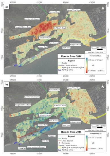 While this gives an indication of point locations with high VLOS, it is still not directly comparable to purely vertical measurements obtained during field surveys and does not offer insight into the overall trends occurring throughout the Ventnor landslide. Using the methods described in Section 3.2, estimates of VU and VE were obtained for a windowed sample of suitable scenes collected during 2016, as shown in Figure 8a,b.