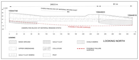 It is seen that there is a significant E-W component to the landslide, which was not been captured in the ground model developed by Halcrow [], previously presented in Figure 2b. To further investigate the nature of this movement, a 2D ground model was generated using BGS publicly available borehole records located west of Ventnor Park []. A failure surface inclined at approximately 3° to the horizontal and dipping to the east is recorded at 0 mOD in the Gault Clay and chalk debris, however no description of the shape is given. This failure surface is approximately drawn on the cross section in Figure 9, showing that the overlying block of material is sliding eastward along the postulated failure surface, while the underlying block of material remains static. A similar W-E component is observed throughout Ventnor town, however it is not as significant due to the presence of heavier defences spanning further east. It is likely both of these are second order movements caused by the more significant N-S sliding mechanism (not detected by InSAR due to sensing geometries) resulting in lateral spread. Qualitatively, the results aligned well with observations from InSAR data, showing that InSAR can be used to predict possible failure surfaces when paired with intrusive investigations. This served as a verification of results from InSAR, allowing the authors to proceed with analysis for the full time series. The true range of values for VU was −18.7 to +30 mm a−1, and VE −16.9 to +14.5 mm a−1, VU being within the ranges presented in Table 4.