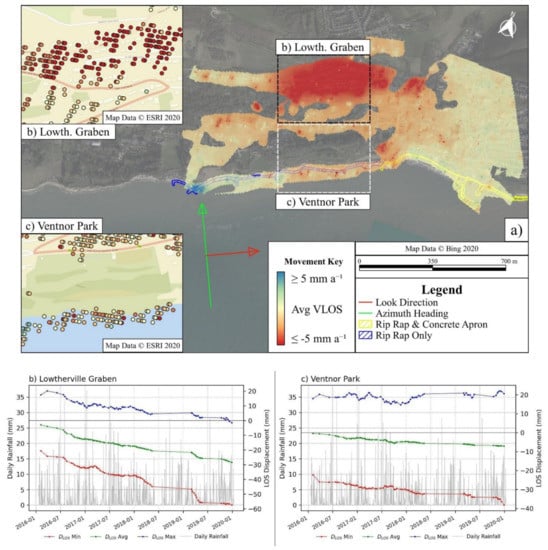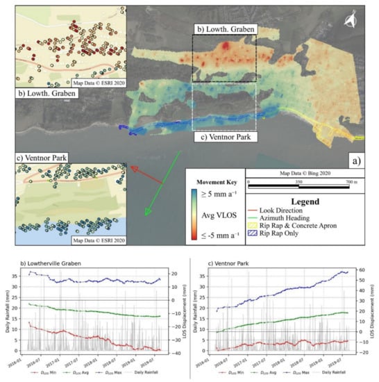 In this section, processed InSAR results are presented to determine ground movement rates and causes on the Ventnor landslide. Standard InSAR methodology as described in Section 3.1 and Section 3.2 were followed, and average velocity/displacement maps were compared with time series plots DLOS and daily rainfall records from the Ventnor Park rain gauge [].