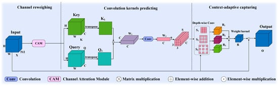 In order to control the computation cost and maintain the spatial information, we utilize matrix multiplication to predict the convolution kernels. The input feature map is first transformed into the query feature map and the key feature map , respectively, which is implemented by 1 × 1 convolutions to reduce the computation.