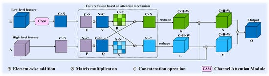 To effectively combine the multi-scale feature maps, we propose the dual attention feature fusion module (DAFFM), as illustrated in Figure 3, which is based on both spatial and channel attention mechanisms. Given the deeper-level feature map A and the lower-level feature map B, where A is generated by the ACAM, we first re-weigh the lower feature map by the module illustrated in Figure 4 and utilize the 1 × 1 convolution to compress the channels to generate the feature map , where c, h and w represent the height, width, and channels of the feature map.