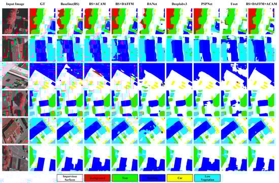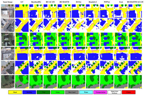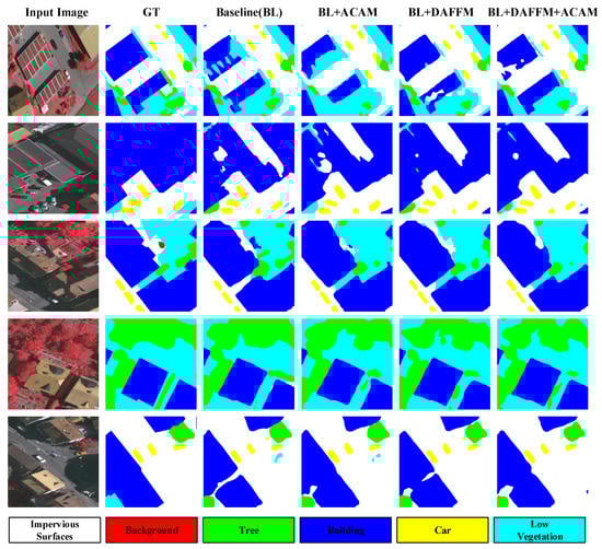 In order to show discrimination of each module directly, we visualize the comparison results based on ISPRS 2D Semantic Labeling Vaihingen data [] as illustrated in Figure 5. It is shown that DAFFM obtains the better segmentation performance compared to the baseline, which is consistent with our analysis mentioned above. On the other hand, ACAM also achieves better performance on some small targets visually, compared to the baseline, which contributes to aggregating the multi-scale contextual cues. By combining the advantages of DAFFM and ACAM, our method obtains the best performance according to the visual segmentation result.