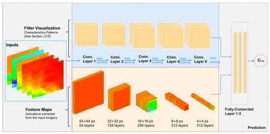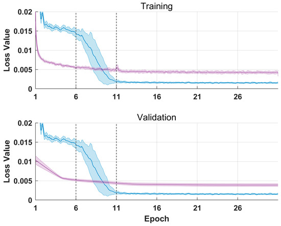 The stochastic gradient descent with momentum (SGDM) optimizer, which utilizes mini-batch stochastic gradient, was employed for optimization. The batch size was set to 128 and momentum to 0.9. To alleviate the overfitting, the L2 regularization was added to the loss function during the network’s backpropagation (the L2 penalty multiplier was set to 1.0 × 10−5), whereas the dropout regularization for the first two fully connected layers was adopted. The dropout ratio was set to 0.5, indicating that 50% of the neurons in the two fully connected layers were temporally retained when computing the loss function for the weights’ updating. In the training phase, the number of epochs was set to 30, and the initial learning rate was set to 0.01, with a drop factor of 0.1 after every 10 epochs. The half-mean-squared-error was used as the loss function, which is defined as: