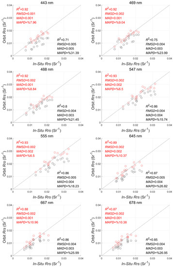 The scatterplots in Figure 5 showed the in-situ measurements versus the Rrs before (‘black’ plots) and after (‘red’ plots) adjustment at all visible bands. The approach appeared quite effective at those center wavelengths, with the largest differences between in-situ and orbit measurements, which were 443 and 469 nm, and other shorter wavelengths. As expected, a better performance after the adjustment was observed. Specifically, the RMSD and MAPD of MODIS derived Rrs, with respect to in-situ measured Rrs at 443 nm, had shown values of 0.005 Sr−1 and 31.4% before adjustment and a value of 0.001 Sr−1 and 7.3% after adjustment, respectively.