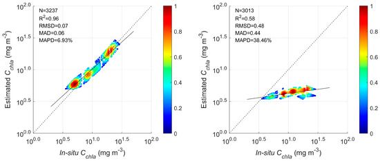 Scatterplots of model-estimated and in-situ measured Cchla.