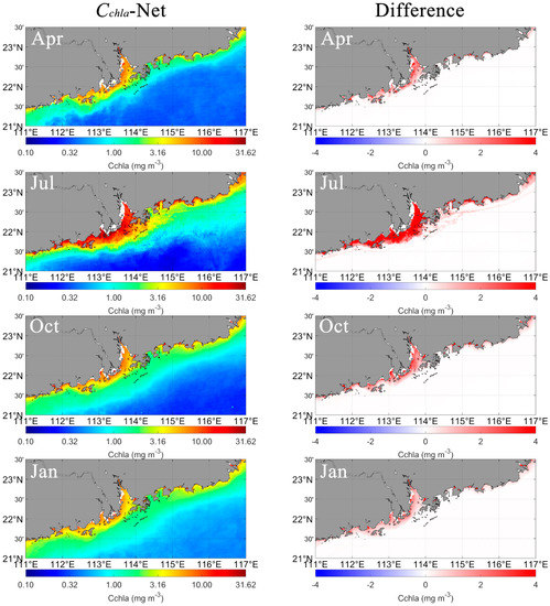 Given the satisfactory performance of the proposed Cchla-Net developed using in-situ dataset from PRE, this model was applied to all available MODIS/Aqua Cchla data between 2003 and 2020 to construct a multi-year product for PRE waters. Figure 9 showed the climatological monthly MODIS/Aqua Cchla estimated by Cchla-Net and the difference between Cchla-Net and OC3M models in the PRE. In general, the estimated Cchla from both models agreed well in the temporal patterns in the continental shelf. However, the difference between the two models in the coastal and estuarine areas was remarkable. Especially during summer, the maximal difference was up to 5.80 mg·m−3. Such differences were mainly due to the worse performance of OC3M model for high Cchla (>10 mg·m−3). Therefore, it is likely that Cchla-Net could serve as a better approach to provide the long-term MODIS/Aqua products than the classical OC3M model in the PRE waters. As expected, Cchla increased from the continental shelf to the coastal and estuarine area, as the latter received more direct influence of the highly productive freshwater. After exiting the LBPRE, the discharged freshwater generated a nearly stable bulge and formed a distinct plume, which was located in the southwestern LBPRE. The plume axis gradually shifted offshore as a result of the intensified Ekman drift. Therefore, The Cchla of western PRE was observed to be higher than that of eastern PRE. During summer, a tongue with a relatively higher Cchla tends to expand to the southern and southeastern LBPRE. Forced by the wind-driven coastal current, the plume was wider over the shelf due to the freshwater in the outer part of the bulge flowing downstream at the speed of the current. During winter, the plume was confined nearshore under the influence of the northeastly wind.